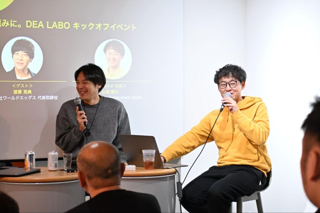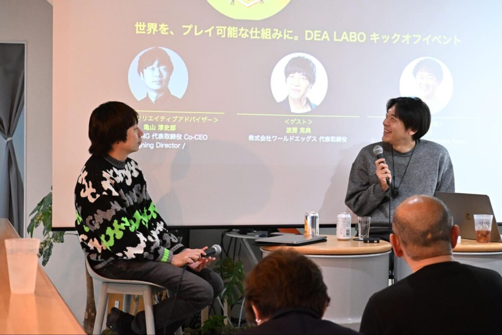 当日は「DEAラボ所長」である、DEA代表取締役社長の山田耕三を中心に、「DEAラボ クリエイティブアドバイザー」の株式会社SIGNING 亀山淳史郎氏とともに、株式会社ワールドエッグス 波房克典氏をゲストに迎え、「ゲーミフィケーションのその先」にある社会設計の可能性について語り合いました。本記事では、当日の熱気ある議論の模様をお届けします。